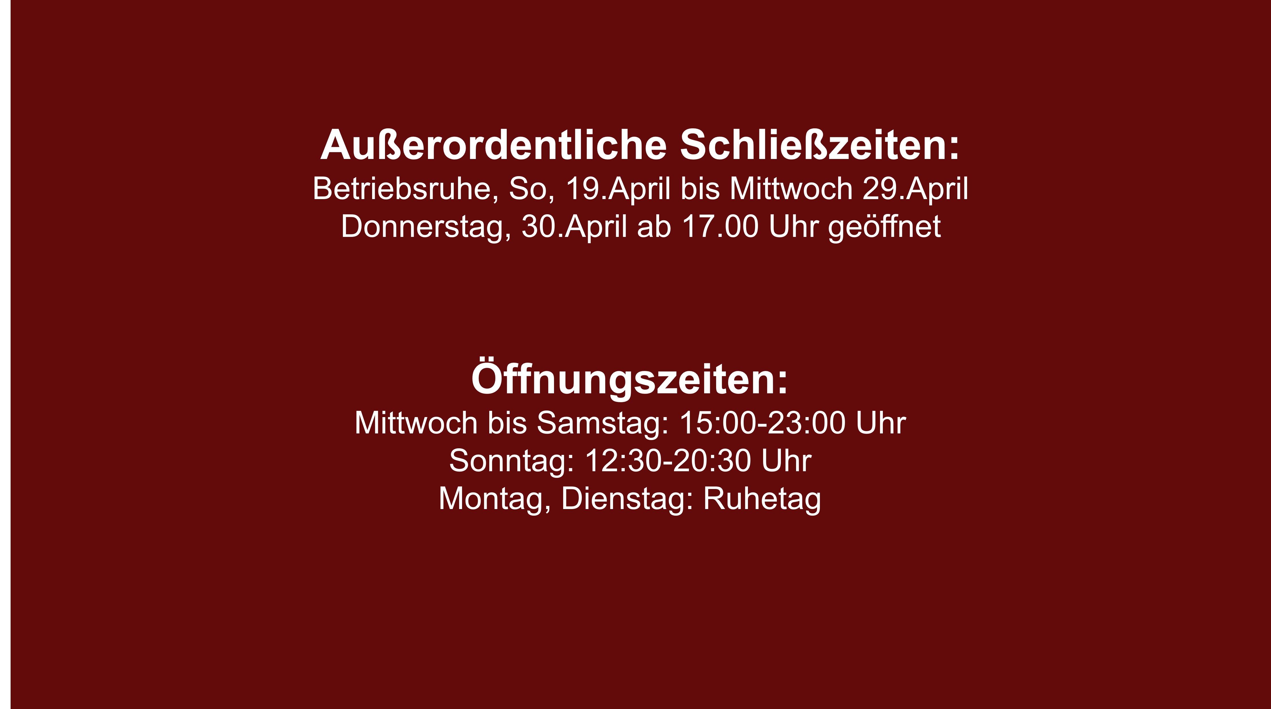 Mittwoch bis Samstag: 15:00-23:00 Uhr